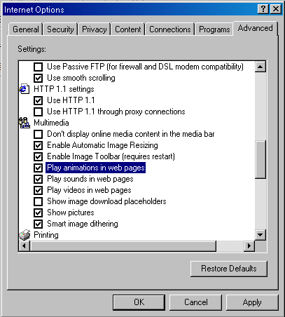 Internet Options, click on the Advanced tab, scroll down to the Multimedia